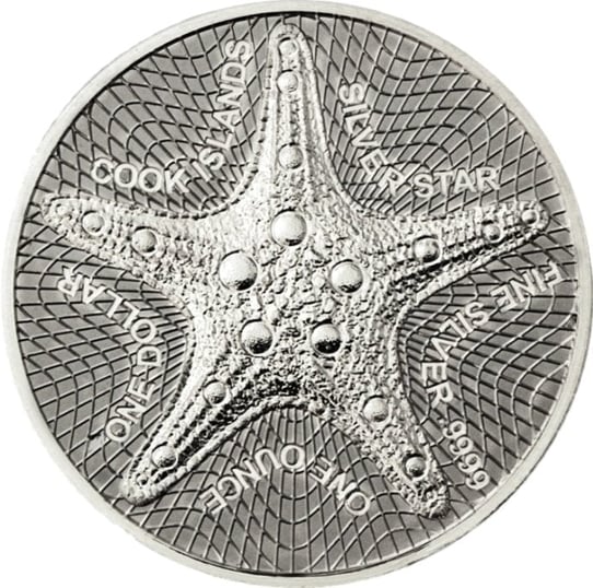 Der Linien im Hintergrund der Wertseite dieser beeindruckenden Silbermünze sehen also, wie viele kleine Wellen. In der Mitte dieser Wellen befindet sich ein fünfarmiger Seestern. Dieser wurde mitsamt Saugnäpfen naturgetreu dargestellt. Zwischen all den Armen des Tieres stehen jeweils wertvolle Informationen zur Münze. Es wird angegeben, dass der Nennwert der Münze einen Dollar beträgt, die Stückelung 1 Unze lautet und die Münze aus den Cook Islands stammt sowie zu 99,99 % aus hochwertigem Silber besteht.