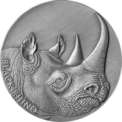 Die Vorderseite der Silbermünze zeigt das Profil eines Nashorns. Das Tier sieht ein wenig müde und erschöpft aus. Die Augen und Ohren des Nashorns sind sehr klein. Auffällig ist, dass das Nashorn mit gleich zwei Hörnern ausgestattet ist. Das trifft nicht auf jede Nashorn-Art zu. Um welche Nashorn-Art es sich bei diesem Tier handelt, wird links unten angegeben: „Black Rhino“. Auf Deutsch heißt die Rasse „Spitzmaulnashorn“.