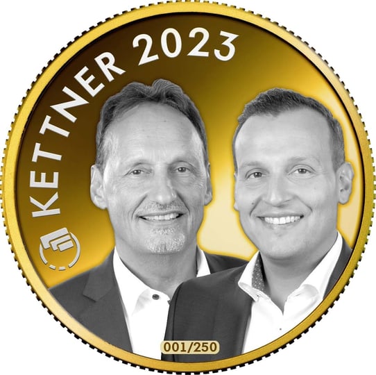 Der Hintergrund wurde vergoldet und glänzt richtig. Unter dem Motiv finden Sie, ebenfalls in Gold, eine Zahl zwischen 1 und 250. Die Gesamtausgabe der Münze ist auf nur 250 Stück limitiert und Sie können anhand dieser Zahl sehen, welche Ausgabe Sie erworben haben. Links über den Köpfen von Jürgen und Dominik Kettner ist das Logo des Unternehmens eingraviert sowie der Name Kettner. Daneben steht zudem das Jahr, in dem die Münze geprägt wurde: 2023.
