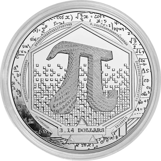Auf der Vorderseite dieser Silbermünze ist die Zahl Pi eingraviert. Sie sieht aus wie ein großes Tor. Im Hintergrund sind mehrere mathematische Formeln und Gleichungen zu sehen. Pi ist ein griechischer Buchstabe und der sechzehnte Buchstabe im griechischen Alphabet. Er wird als Abkürzung für die Kreiszahl verwendet, die aus diesem Grund auch einfach als Pi bekannt ist. Andere Namen für die Kreiszahl sind außerdem die Ludolphsche Zahl oder Archimedes Konstante. Mittlerweile sind bereits mehrere Millionen Nachkommastellen der Kreiszahl berechenbar. In der Praxis werden jedoch in der Regel nur die ersten beiden Nachkommastellen verwendet. Somit lautet die Kreiszahl: 3,14. Und genauso hoch (3,14 Dollar) ist auch der Nennwert der Münze Diesen finden Sie unter dem Pi-Motiv über einem rechtwinkligen Dreieck.