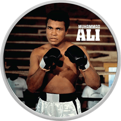 Einzigartige Kolorierung: Hochwertige Farbgebung ehrt Muhammad Ali's Vermächtnis auf einer Silbermünze