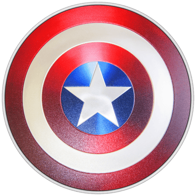 Einer der Superhelden von Marvel™ ist Steve Rogers, alias Captain America™. Er ist durch und durch ein US-amerikanischer Patriot. Seine Geschichte beginnt während des Zweiten Weltkriegs, als er sich als junger Mann bei der US Army bewarb, um für sein Land im Militär zu kämpfen. Doch seine Bewerbung war erfolglos. Er hatte einfach nicht die nötige Muskelmasse und Stärke, die ihn als Kandidat attraktiv gemacht hätte. Stattdessen wurde jemand anders auf ihn aufmerksam und fand ihn interessant: ein Wissenschaftler, der ihn für eins seiner Experimente nutzen möchte. Steve Roger willigte ein und das Experiment veränderte sein Leben grundlegend. Er konnte auf einmal Höchstleistungen in Sachen Stärke, Schnelligkeit, Ausdauer, Reflexe und mehr bringen. Er beschloss somit, sein Vorhaben, die USA zu beschützen, unter einer geheimen Identität umzusetzen. Er nannte sich Captain America™. Sein Anzug ist daher blau und rot mit einem weißen Stern auf der Brust. Als Ausrüstung hat er ein Schutzschild. Das Schutzschild ist auf der colorierten Motivseite der Silbermünze zu sehen. Auf dem weiß-roten Schild ist in der Mitte ein blauer Kreis zu sehen, auf dem ein weißer Stern abgebildet ist. Durch die Farben und den Stern soll an die Flagge der Vereinigten Staaten von Amerika erinnert werden.