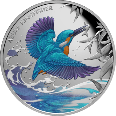Die 1 Unze Silber Azurfischer 2023 PP ist eine faszinierende und farbenfrohe Münze für Sammler und Naturliebhaber. Sie beeindruckt mit ihrem farbenfrohen und detailgetreuen Motiv des Azurfischers, der einen Fisch gefangen hat und aus dem Wasser emporsteigt. Die leuchtenden Farben unterstreichen die Schönheit des azurblauen Gefieders des Eisvogels und machen diese Münze zu einem echten Hingucker.