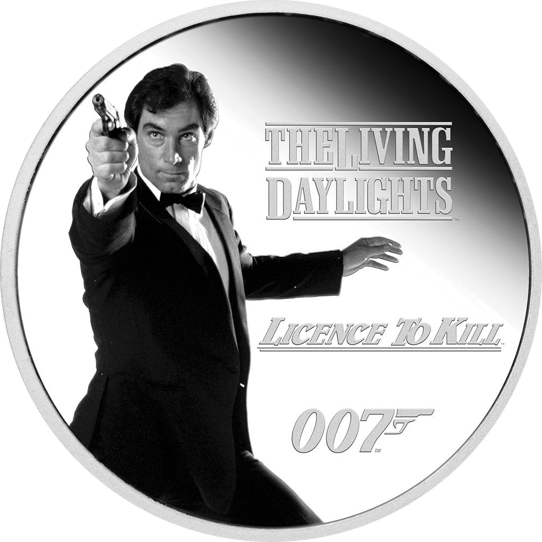 Die Münze zeigt ein schwarz-weißes Bild von Timothy Dalton in einer klassischen Bond-Pose. Das Design enthält das ikonische 007-Pistolenlauf-Logo der Franchise und die Titel von Timothy Daltons beiden Filmen. Die Münze trägt das Queen Elizabeth II Memorial Obverse, das das Ian Rank-Broadley Porträt ergänzt mit den Daten ihrer Herrschaft, sowie dem Gewicht der Münze, der Reinheit, der Währungsdenomination und dem Prägejahr 2023.