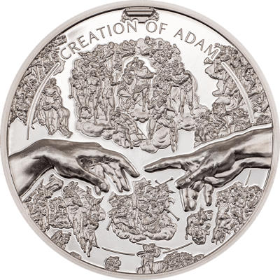 Einzigartige Kunstwerke: Die Münze bildet das fast berührende Hände-Motiv aus einem berühmten Deckenfresko von Michelangelo in der Sixtinischen Kapelle ab und repräsentiert die Erschaffung Adams – des ersten Menschen. Zusätzlich wird ein Teil von Michelangelos monumentalem Werk – Das Jüngste Gericht – offenbart.