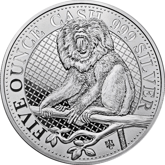 Die Münze ist dem Bartaffen gewidmet, einer Primatenart aus der Gattung der Makaken, die im südwestlichen Indien lebt und in ihrem Bestand bedroht ist. Das detailreiche Abbild des Bartaffen vor einem auffällig gemusterten Hintergrund macht diese Münze zu einem echten Blickfang. Die Aufschriften "FIVE OUNCE", "CASH" und "999 SILVER" umranden das Design und unterstreichen den hohen Silbergehalt dieser Münze. Die Rückseite zeigt das Porträt von König Charles III. sowie den Nennwert und das Ausgabejahr.