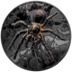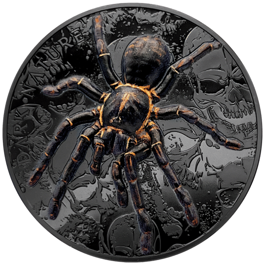 Die Münze wurde aus 3 Unzen 99,9% reinem Silber in Black Proof und Ultra High Relief geprägt. Sie zeichnet sich durch ein einzigartiges Design aus, das eine Schwarze Thai-Vogelspinne in Farbe zeigt. Der Hintergrund der Münze ist mit einem Muster aus Totenköpfen gestaltet, was die dunkle Natur des Motivs unterstreicht.