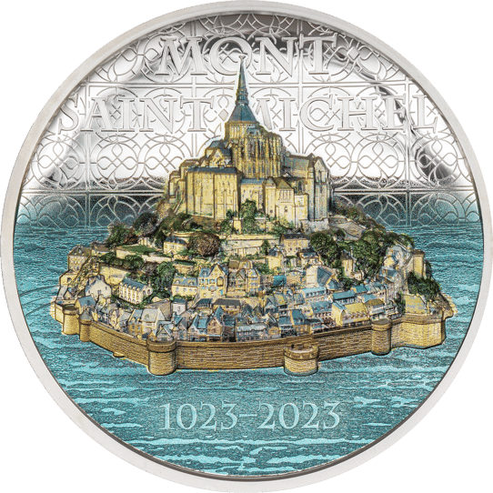Die Münze zeigt auf der Vorderseite die Gemeinde Mont-Saint-Michel und die Abtei Mont-Saint-Michel, welches das Bild der Gemeinde dominiert. Unter dem Bild der Insel sind im Meer die Jahreszahlen 1023 - 2023 zu sehen, welche auf das 1.000-jährige Bestehen hinweisen. Die feine Kolorierung und das High Relief lassen das Motiv sehr lebendig wirken und machen diese Münze zu einem echten Schmuckstück.