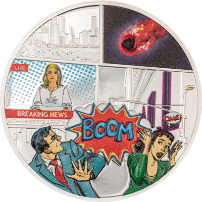 Diese Silbermünze fasziniert nicht nur durch ihr Material, sondern auch durch ihr einzigartiges Design. Auf der Vorderseite ist im Comicstil das Szenario eines Meteoriteneinschlages dargestellt. Als besonderes Highlight ist ein Teil eines echten Meteoriten auf der Münze angebracht. Die Rückseite zeigt das Abbild der Queen Elisabeth II, was die Münze zu einem echten Sammlerstück macht.