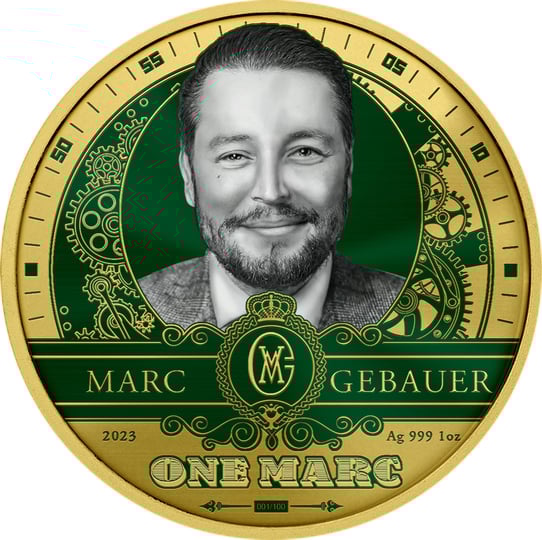 Das Herzstück dieser Sammlermünze ist das Portrait des bekannten Persönlichkeit Marc Gebauer, umrahmt von Teilen eines Uhrwerks, das im Hintergrund zu sehen ist. Der Schriftzug und der Rand sind vergoldet und verleihen der Münze einen Hauch von Luxus. Die Vorderseite präsentiert sich mit grünen Farbakzenten, die zusammen mit den vergoldeten Elementen ein harmonisches und doch kontrastreiches Bild erzeugen.