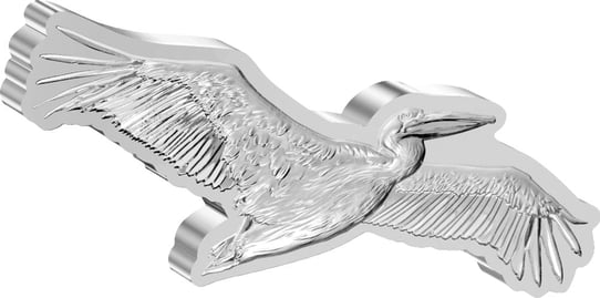 Der Rosapelikan, ein Vogel, der für sein rosa Gefieder und seinen imposanten Schnabel bekannt ist, wird auf dieser Münze in einem dynamischen Flugmoment mit ausgebreiteten Flügeln dargestellt. Das Design zeichnet sich durch eine besonders detailreiche und realitätsnahe Optik aus, die das Gefieder und die Augen des Vogels mit erstaunlicher Präzision wiedergibt. Die unregelmäßige Form der Münze folgt dabei der Silhouette des Pelikans und verleiht ihr dadurch eine außergewöhnliche Dreidimensionalität.