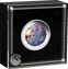 Auf der Vorderseite der Münze wird der Betrachter von einem majestätischen, colorierten Schwan in Szene gesetzt, der auf einer Wasserfläche bei Sonnenuntergang gleitet. Die feinen weißen Federn mit dezenten blauen Schattierungen und der kontrastreiche rote Schnabel verleihen dem Motiv eine lebendige Eleganz. Umrahmt wird diese Szenerie von einem lila Himmel mit Sternen und der goldenen Reflexion der Sonne auf der Wasseroberfläche. Die präzise Colorierung und die detailreiche Darstellung machen diese Silbermünze zu einem Highlight für Sammler und Liebhaber ausgefallener Edelmetallprodukte.