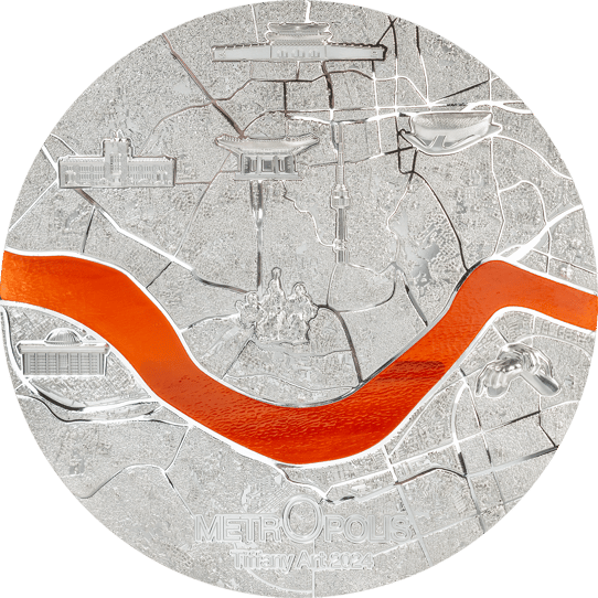 Die Vorderseite der Münze präsentiert stolz die Han-Brücke als zentrales Motiv, ein Sinnbild für die Verbindung von Tradition und Moderne in Seoul. Die Rückseite hingegen fängt den Betrachter mit einer detailreichen kartografischen Darstellung Seouls ein, die durch einen strahlenden, orangefarbenen Glaseinsatz akzentuiert wird, welcher den Han-Fluss repräsentiert. Dieser Glaseinsatz, eine Spezialität der Tiffany Art-Serie, bietet einzigartige Farbspiele und verleiht der Münze eine beeindruckende Tiefenwirkung. Die Prägung in Ultra High Relief lässt jedes Detail plastisch hervortreten und macht die Münze zu einem dreidimensionalen Kunstwerk.
