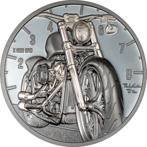 Die Vorderseite der Münze präsentiert ein präzise gearbeitetes Relief eines Chopper-Motorrads, das mit seiner detaillierten Darstellung des Motors und der Speichenräder besticht. Der große, runde Scheinwerfer und die markanten Auspuffrohre verleihen dem Motiv eine beeindruckende Präsenz. Umrahmt wird die Darstellung von einem Drehzahlmesser, der mit einer Skalierung von 1 bis 8 und der Aufschrift "x1000 RPM" die Geschwindigkeit und Kraft des Bikes symbolisiert. Der Schriftzug "Rider 70L" am unteren Rand vervollständigt das Bild und zollt dem Geist der Freiheit Tribut.
