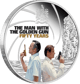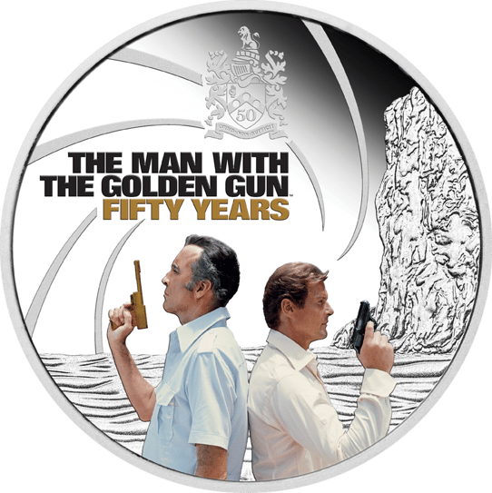 Das farbenfrohe Motiv der Münze zeigt James Bond und seinen Gegenspieler Francisco Scaramanga in einer ikonischen Pose, Rücken an Rücken, wie sie sich zu Beginn ihres legendären Pistolenduells gegenüberstehen. Im Hintergrund erstreckt sich eine malerische Darstellung des Meeres und der Insel, überlagert von den charakteristischen Spiralformen aus dem berühmten 007-Logo. Oberhalb der Szene prangt die Aufschrift "THE MAN WITH THE GOLDEN GUN FIFTY YEARS", gekrönt vom Bond-Familienwappen mit dem Motto "ORBIS NON SUFFICIT" (die Welt ist nicht genug) und der Zahl 50, die an das bedeutende Jubiläum erinnert.