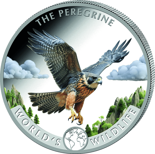 Die Vorderseite der Münze präsentiert stolz einen colorierten Wanderfalken im Flug, dessen majestätische Erscheinung mit einem Hintergrund aus grünen Bäumen, Felsen und weißen Wolken kontrastiert wird. Die kunstvolle Darstellung und die lebendigen Farben des Motivs zeigen die Detailverliebtheit, mit der diese Münze geprägt wurde. "THE PEREGRINE" und "WORLD'S WILDLIFE" umschließen das Bildnis des Falken und betonen seine Bedeutung innerhalb der Serie. Ein kleines Symbol der Erde ziert die Münze zwischen den Inschriften und symbolisiert die Verbundenheit des Wanderfalken mit der Welt, in der wir alle leben.