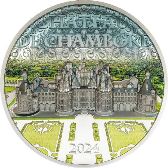 Die Rückseite der Münze zeigt das Schloss Chambord in voller Pracht. Mit seiner unverwechselbaren Architektur, die traditionelle mittelalterliche Elemente mit klassischen italienischen Einflüssen verbindet, ist es ein Symbol der kulturellen Blüte Frankreichs. Türmchen, Zierschornsteine und kunstvoll geschnitzte Fassaden sind in der High Relief Prägung so detailgetreu nachgebildet, dass man fast den Geist der Renaissance spüren kann. Ergänzt wird dieses prachtvolle Bild durch den umgebenden, bewaldeten Park und die Inschriften „CHATEAU DE CHAMBORD“ und „2024“, die den historischen und zeitlichen Kontext der Münze perfekt einfangen.
