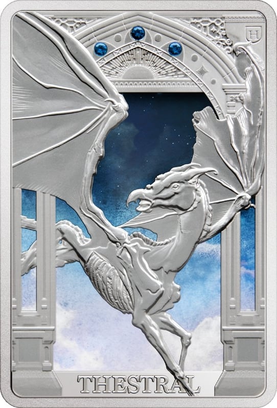 Die rechteckige Münze wurde aus einer Unze 99,9% reinem Silber gefertigt und besticht durch ihre außergewöhnliche Prägequalität. Die Polierte Platte (PP) sorgt für eine spiegelglatte Oberfläche, die das Motiv besonders eindrucksvoll zur Geltung bringt. Das Hauptmotiv zeigt einen Thestral™ – ein magisches Wesen aus der Harry Potter™-Welt, das mit seinem skelettartigen Körper und den großen, fledermausartigen Flügeln eine geheimnisvolle Aura verbreitet.