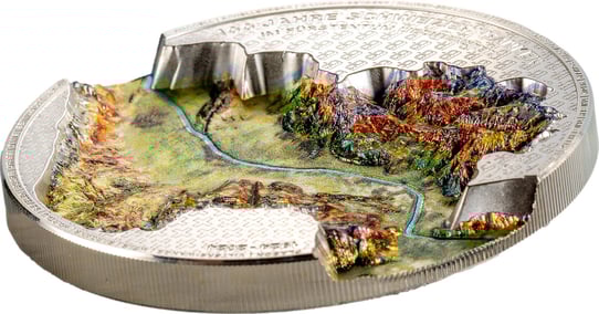 Das Motiv dieser Münze ist schlichtweg atemberaubend. Die Rückseite zeigt das Rheintal in einer unglaublichen Detailtreue und realistischen Farbgebung. Die topografische Genauigkeit und die High Relief Prägung lassen die Landschaft nahezu lebendig wirken. Am Rand der Münze sind alle umliegenden Gemeinden eingraviert, was die Münze zu einem numismatischen Naturwunder macht.