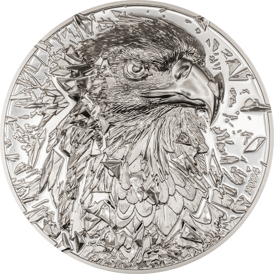Die Rückseite der Münze zeigt einen imposanten Adlerkopf, der aus einem zerbrochenen Glaseffekt hervortritt. Diese außergewöhnliche Gestaltung betont die wilde und majestätische Natur des Adlers und lässt die Münze zu einem wahren Blickfang werden. Die hochglanzpolierte Oberfläche und die High Relief Prägung sorgen für eine beeindruckende Optik und Haptik. Die komplizierten Details heben die Textur der Federn und die Intensität des Blicks des Adlers hervor.