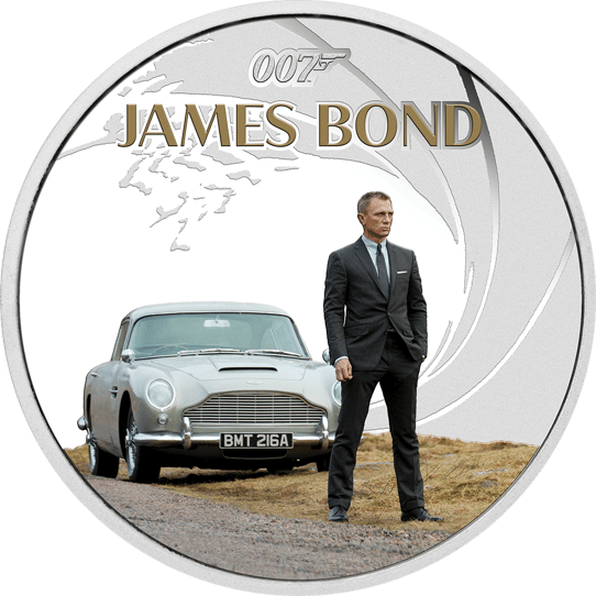 James Bond Design: Farbiges Porträt von Daniel Craig und Aston Martin DB5 machen die Münze einzigartig