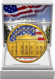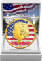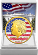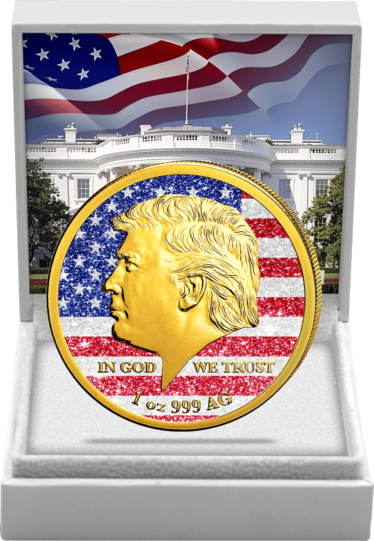 Die Vorderseite zeigt das markante Profil des 45. US-Präsidenten Donald J. Trump in einer beeindruckenden Teilvergoldung. Der Hintergrund wird von der amerikanischen Flagge geziert, die durch eine innovative Diamantstaub-Veredelung einen faszinierenden Glitzereffekt erhält. Die Inschrift "IN GOD WE TRUST" sowie die Gewichts- und Feinheitsangabe runden das Design stilvoll ab.