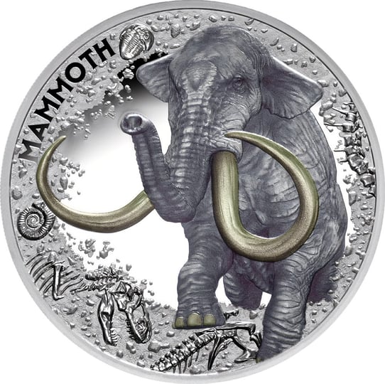Faszinierendes Mammut-Design: Das imposante Motiv des prähistorischen Giganten besticht durch seine teilkolorierte Prägung, goldene Stoßzähne und eine detailreiche Gestaltung in höchster Prägequalität