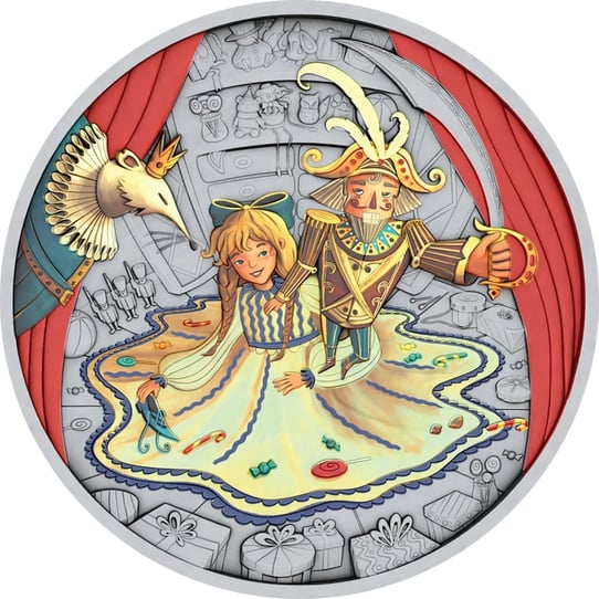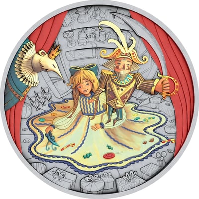 Das aufwendig gestaltete Motiv zeigt die Protagonistin Marie zusammen mit dem Nussknacker in einer dramatischen Szene. Die teilweise farbige Gestaltung und das hochwertige Antik Finish verleihen der Münze eine besondere Tiefe und Lebendigkeit. Am linken Münzrand lauert der bösartige Mäusekönig, während der Nussknacker sein Schwert kampfbereit hält.