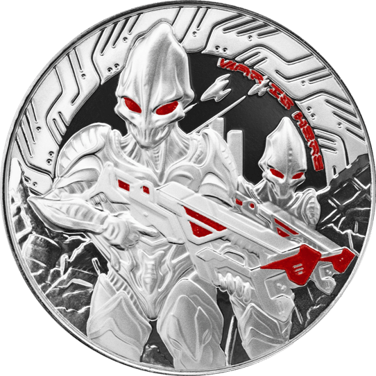Faszinierendes Design: Die detailreiche Prägung zeigt imposante Alien-Krieger mit rot leuchtenden Augen in futuristischer Rüstung, veredelt durch hochwertige Colorierung