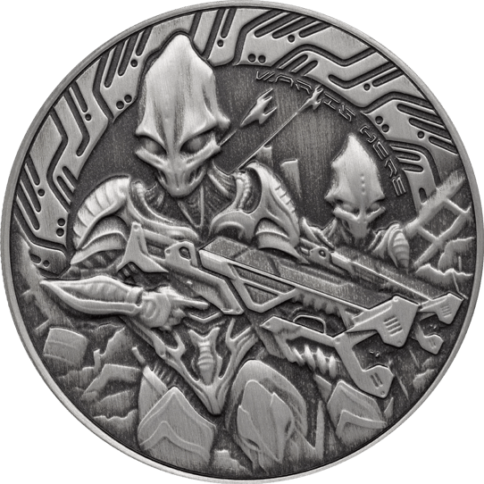 Faszinierendes Sci-Fi-Design: Die detailreiche Darstellung kampfbereiter Aliens in hochwertigem Antik-Finish macht diese 1-Unzen-Silbermünze zu einem einzigartigen Sammlerstück