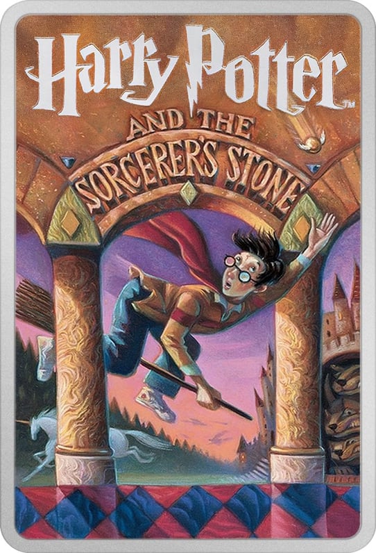 Das rechteckige Format dieser 2-Unzen-Münze bietet die perfekte Leinwand für das detailgetreu nachempfundene Cover des ersten Harry-Potter-Bandes. In Polierter Platte geprägt und mit aufwendiger Farbapplikation veredelt, zeigt die Vorderseite den jungen Zauberlehrling Harry auf seinem Besen, während im Hintergrund das majestätische Hogwarts-Schloss und ein galoppierendes Einhorn zu sehen sind.