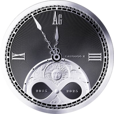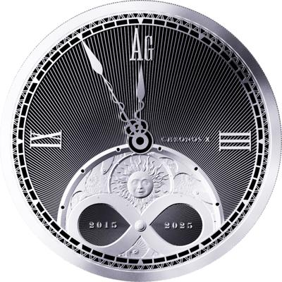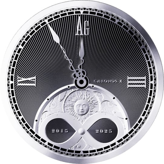 Das kunstvolle Design der Münze vereint klassische Eleganz mit moderner Symbolik. Im Zentrum steht ein detailreich gestaltetes Zifferblatt, das von filigranen Ornamenten umrahmt wird. Das Unendlichkeitssymbol mit den Jahreszahlen 2015-2025 symbolisiert dabei die zeitlose Bedeutung von Edelmetallen. Die Sonnendarstellung im oberen Bereich unterstreicht die ewige Kraft und den bleibenden Wert dieser besonderen Rarität.