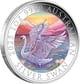 Kunstvolles Farbdesign: Der majestätische Schwan mit schimmerndem Gefieder vor dramatischer Bergkulisse in warmen Pastelltönen verkörpert höchste Prägekunst der Perth Mint