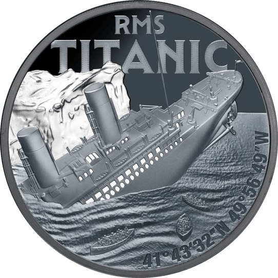 Das Motiv der 1-Unzen-Münze zeigt in beeindruckender Detail-Tiefe die RMS Titanic in ihren letzten Stunden. Im dramatischen Black Proof Finish sehen wir das majestätische Schiff, wie es nach der Kollision mit dem Eisberg zu sinken beginnt. Die drei dargestellten Rettungsboote im Vordergrund und die präzise eingravierten Koordinaten der Untergangsstelle (41°43'57"N 49°56'49"W) verleihen dem Motiv zusätzliche historische Authentizität.