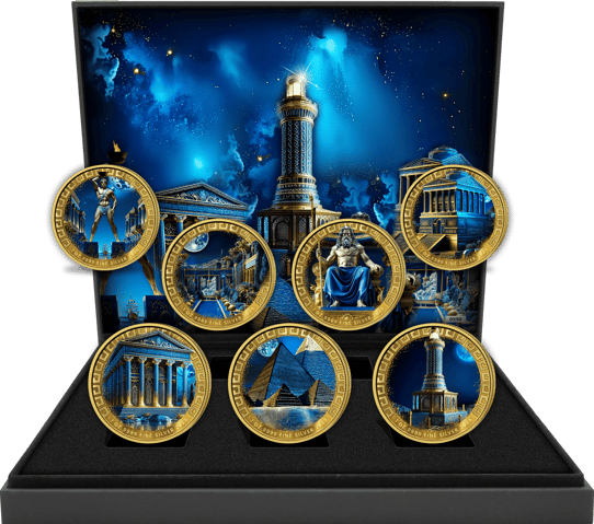 Die sieben Weltwunder der Antike gehören zu den faszinierendsten Bauwerken der Menschheitsgeschichte. Dieses Set vereint ihre zeitlose Schönheit in einer numismatischen Meisterleistung.