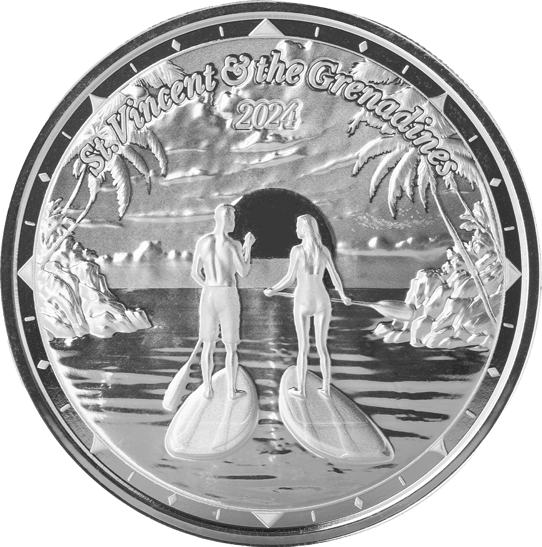 Das aufwendig gestaltete Motiv zeigt ein Paar auf Paddleboards vor einer traumhaften Küstenlandschaft St. Vincents. Umrahmt von majestätischen Palmen und unter einem strahlenden Himmel, vermittelt die Szene pure Lebensfreude und karibische Gelassenheit. Die streng limitierte Auflage von nur 25.000 Stück macht diese Münze zu einem begehrten Sammlerstück.