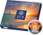 Das Motiv zeigt ein Paar auf Paddleboards vor einer atemberaubenden Kulisse. Der orangerote Sonnenuntergang, die türkisblaue Lagune und die silhouettenhaften Palmen erschaffen eine romantische Atmosphäre. Die Figuren sind in einem strahlenden Silberton gehalten, der einen wunderbaren Kontrast zur farbigen Szenerie bildet.