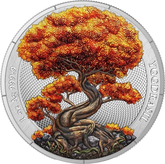 Yggdrasil in prächtigen Herbstfarben – kunstvolle Metallic-Colorierung auf 1 Unze Reinsilber