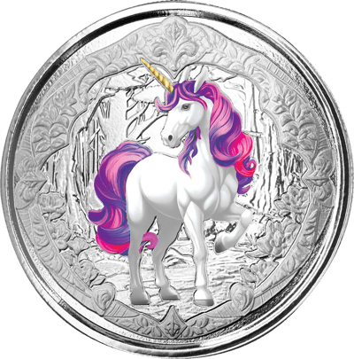 Die Vorderseite zeigt ein majestätisches Einhorn in all seiner Pracht. Besonders faszinierend: Die wallende Mähne und der prächtige Schweif erstrahlen in leuchtenden Pink- und Lilatönen durch aufwendige Colorierung. Diese künstlerische Veredelung macht jede einzelne Münze zu einem visuellen Highlight. Das mythische Wesen steht inmitten einer detailreich gestalteten Waldlandschaft, umrahmt von kunstvollen floralen Ornamenten.