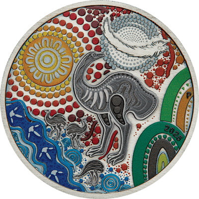 Das spektakuläre Design basiert auf einem Ölgemälde von Chern'ee Sutton, einer renommierten Aborigine-Künstlerin der Kalkadoon. Der majestätische Emu – in der Sprache ihres Stammes "Utingat" genannt – symbolisiert Stärke und Ausdauer. In den Traumzeitgeschichten durchstreift er die heiligen Songlines auf der ewigen Suche nach Wasser und Nahrung. Diese tiefgründige Symbolik macht die Münze zu einem wahren Kunstwerk!