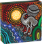 Die farbenfrohe Gestaltung zeigt einen erwachsenen Emu mit drei Jungtieren vor einem abstrakten Hintergrund aus leuchtenden Punkten. Sonne, Hügel und ein Fluss verschmelzen zu einer harmonischen Komposition. Emu-Fußabdrücke führen durch die Landschaft und erzählen die Geschichte einer jahrtausendealten Kultur.