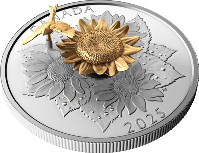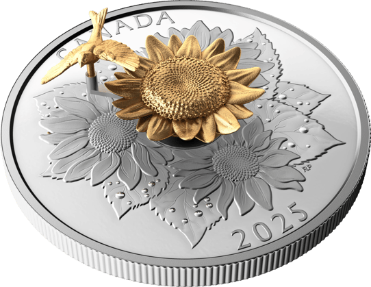 Das Herzstück dieser außergewöhnlichen Münze bildet die meisterhafte Darstellung eines Stieglitzes, der sich anmutig auf einer prächtigen Sonnenblume niedergelassen hat. Die Teilvergoldung verleiht dem Motiv eine besondere Tiefe – während die Sonnenblume in warmem Gold erstrahlt, schimmern die umgebenden Blüten in reinem Silber. Diese kunstvolle Kombination macht jede Münze zu einem kleinen Kunstwerk, das die Schönheit der kanadischen Flora und Fauna einfängt.