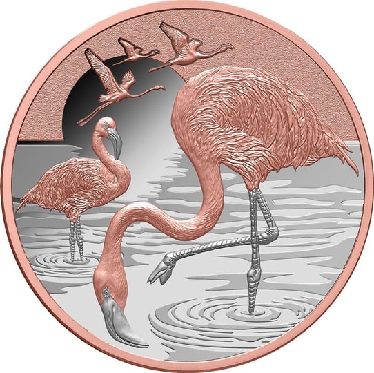Das spektakuläre Design zeigt zwei majestätische Flamingos im Vordergrund, die elegant in einem schimmernden Gewässer stehen. Die detailreiche Federstruktur wurde meisterhaft in der höchsten Prägequalität Polierte Platte herausgearbeitet. Besonders beeindruckend: Die Roségold-Veredelung verleiht den Vögeln ihre charakteristische Farbgebung und lässt sie förmlich aus der Münzoberfläche hervortreten. Im Hintergrund schweben drei weitere Flamingos im Flug – ein Symbol für Freiheit und Anmut.