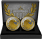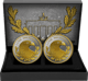 Das Set präsentiert sich in einem hochwertigen Etui, das die beiden Medaillen perfekt in Szene setzt. Die erste Medaille zeigt das weltberühmte Brandenburger Tor in beeindruckender Detailtreue – komplett mit goldener Veredelung der Quadriga und der architektonischen Elemente. Ein wahrhaft majestätischer Anblick! Die zweite Medaille besticht durch das klassische Design der Silbermark. Zwei goldveredelte Eichenzweige rahmen die große "1" ein, während die Aufschrift "SILBER MARK" an die stolze Tradition deutscher Währungsgeschichte erinnert.