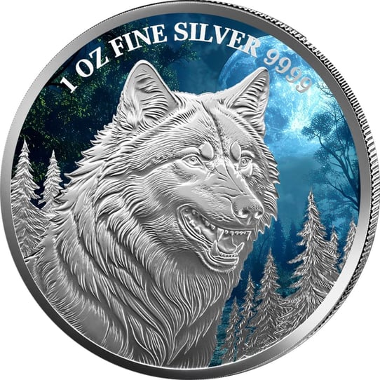 Meisterhafte Prägekunst in Polierter Platte: Höchste Prägequalität trifft auf faszinierendes Wolfsmotiv mit kolorierter Mondnacht-Szenerie – ein wahres Kunstwerk aus reinstem 999,9er Silber