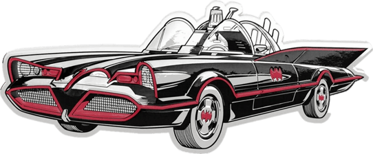Was macht diese Münze so besonders? Sie ist nicht einfach nur geprägt – sie ist geformt wie das legendäre Batmobile selbst! Mit beeindruckenden Maßen von 60 x 24,7 mm verwandelt sich eine Unze reinstes Silber in das kultigste Fahrzeug der Comic-Geschichte. Die charakteristische schwarze Lackierung mit den markanten roten Akzenten wurde perfekt eingefangen. Jedes Detail stimmt: Von den überdimensionalen Heckflossen im Stil der 50er und 60er Jahre bis zur transparenten Kuppel über dem Cockpit.