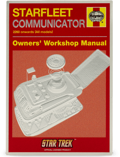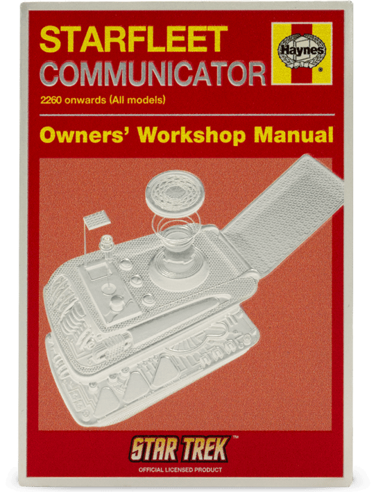 Die Vorderseite präsentiert sich im nostalgischen Haynes-Manual-Stil mit dem aufgeklappten Communicator in beeindruckender dreidimensionaler Optik. Jedes technische Detail wurde mit höchster Präzision in Polierter Platte verewigt - von den charakteristischen Bedienknöpfen bis zur filigranen Oberflächenstruktur.