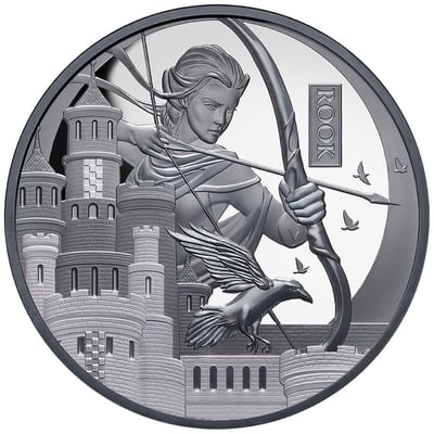 Die Vorderseite dieser außergewöhnlichen Münze zeigt eine imposante Burganlage, deren Türme kunstvoll mit Schachbrettmustern verziert sind. Im Zentrum steht eine elegante Bogenschützin – sie symbolisiert die weitreichende Kraft des Turms, der im Schachspiel aus der Distanz seine volle Stärke entfaltet. Die Aufschrift "ROOK" unterstreicht die internationale Bedeutung dieser Figur.