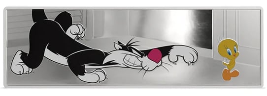 Die New Zealand Mint hat mit dieser außergewöhnlichen Prägung wahre Maßstäbe gesetzt. Auf beeindruckenden 98 x 31 mm entfaltet sich die klassische Verfolgungsjagd in atemberaubender Detailtreue. Sylvester schleicht sich geduckt an seinen gefiederten Gegner heran – die Augen fest auf sein Ziel gerichtet. Tweety hingegen steht völlig unbeeindruckt da, die Hände hinter dem Rücken verschränkt und mit seinen charakteristischen flatternden Wimpern. Diese Szene kennt jeder! Doch in dieser Form aus 999er Feinsilber und in Polierter Platte haben Sie sie garantiert noch nie gesehen.