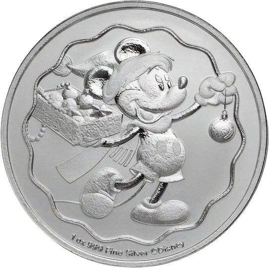 Die Bildseite dieser außergewöhnlichen Prägung zeigt Mickey Maus in seiner ganzen weihnachtlichen Pracht. Der weltberühmte Mäuserich trägt eine klassische Weihnachtsmütze und hält in einer Hand eine glänzende Christbaumkugel, während er unter dem anderen Arm eine prall gefüllte Geschenkebox balanciert. Verspielte Girlanden umrahmen das liebevoll gestaltete Motiv. Am unteren Rand findet sich die Prägung "1 oz 999 Fine Silver ©Disney" – ein Qualitätsversprechen in Silber.